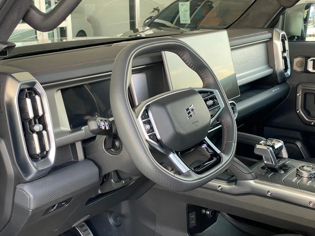 The Premium Cockpit Inside, the rugged exterior gives way to refined digital luxury. The driver-centric cabin features a massive central infotainment touchscreen, a premium audio system, and a futuristic, aviation-inspired gear selector. It perfectly balances the utility of a high-tech control room with the comfort of a modern luxury lounge.